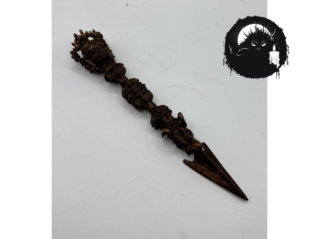 Tento větší amulet vajry s měděnou patinou představuje mocný symbol duchovní síly a rovnováhy. V tradičním kontextu symbolizuje nezničitelnost a propojení mezi hmotou a vědomím. U nás slouží čistě jako dekorace – ať už jako součást oltáře, nebo jako tajemný doplněk k vašemu magickému koutku.