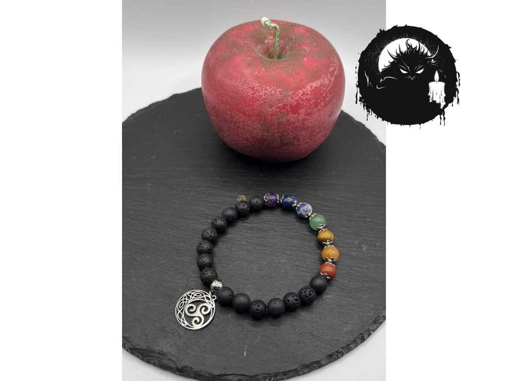 Čakrový náramek z lávy a minerálů, doplněný přívěskem Triskel – symbolem pohybu a energie života.