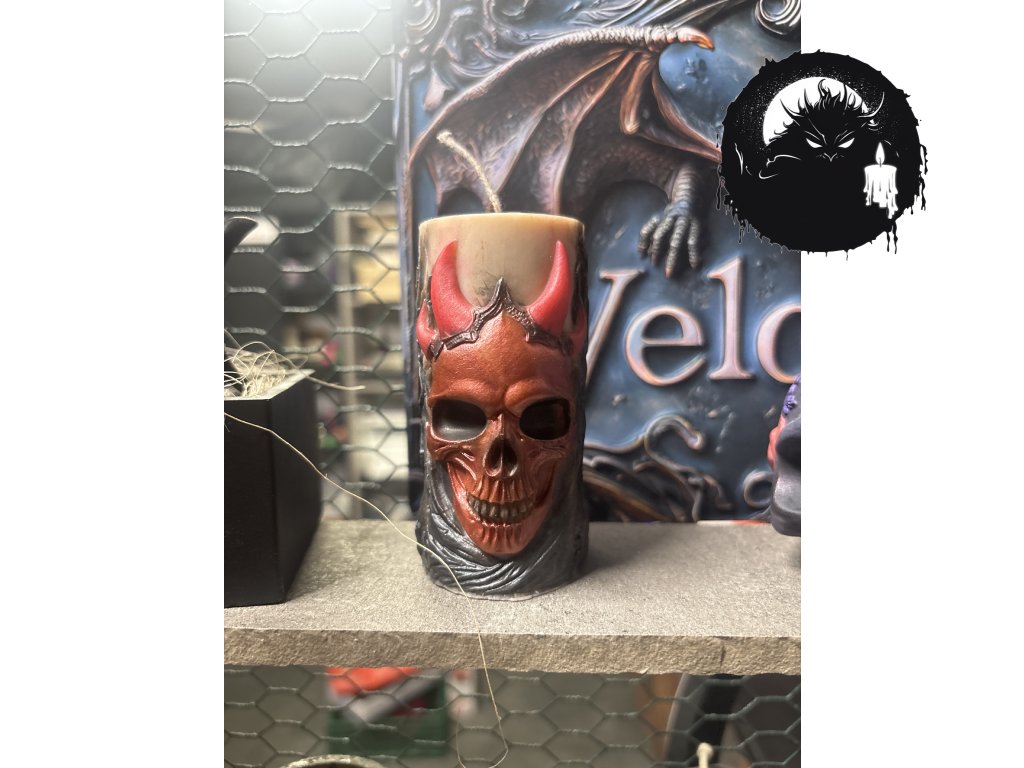Rudá lebka s rohy — stvořená z ohně a temnoty, aby pálila ještě dlouho po zhasnutí. Ručně malovaná.