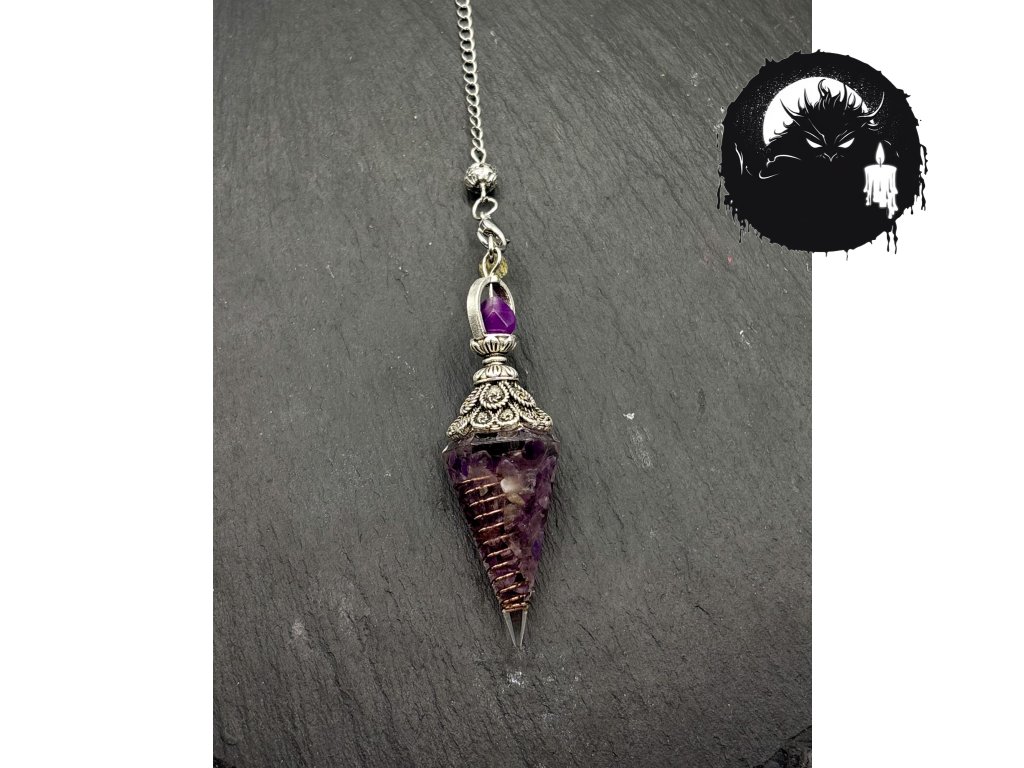 Kyvadlo z ametystu a kovu – spojení síly a intuice. Ametyst je kamenem duchovní ochrany, meditace a vnitřního klidu. Vhodné pro práci s energií, věštění i osobní rituály.