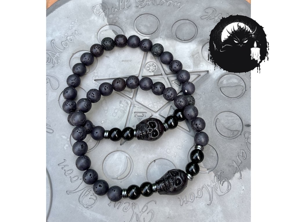 Výrazný pánský náramek z černých přírodních kamenů a lebkou, který spojuje temnou eleganci s energií země. Originální doplněk pro sebevědomé muže, kteří se nebojí trochy tajemna a stylové temnoty.