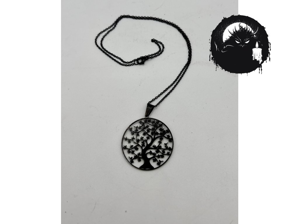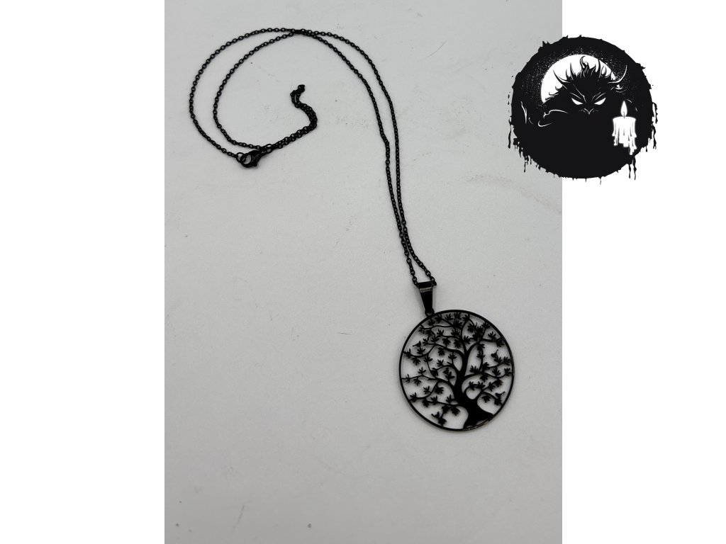 Černý kovový náhrdelník s ikonickým symbolem stromu života – propojujícího kořeny, koruny i světla mezi nimi. Jednoduchý, a přitom výrazný design na černém řetízku, ideální pro každodenní nošení i rituální chvíle.