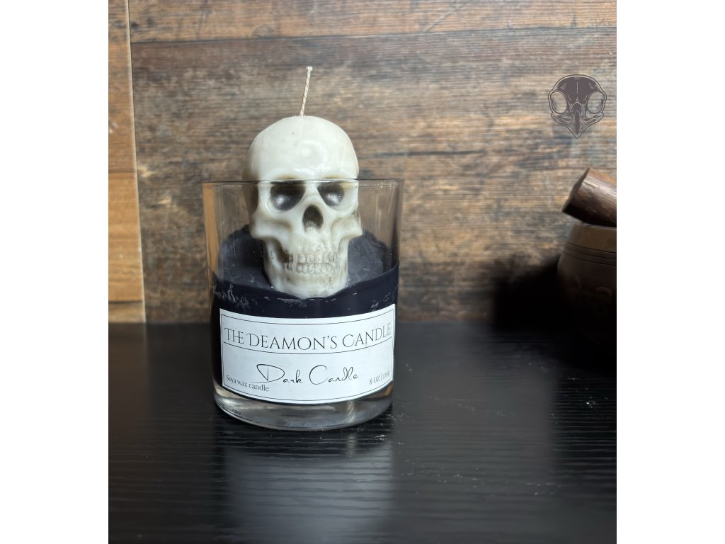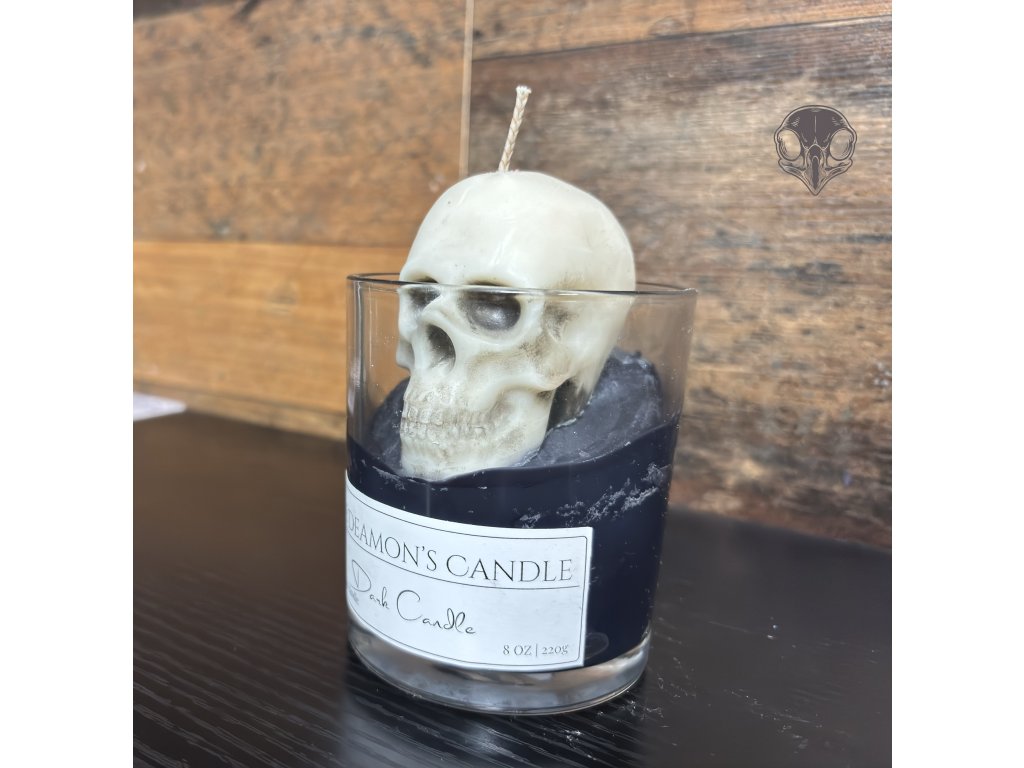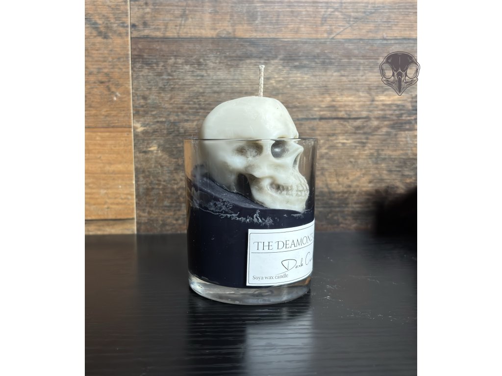 Sójová svíčka, která nehraje na jemnost. Černá hladina, ze které se zvedá lebka — připomínka, že tma je stále přítomná. Zapal ji, když potřebuješ klid, odstup… nebo když je čas přestat si lhát.